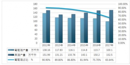 2012-2017年中國(guó)果酒行業(yè)產(chǎn)量及葡萄酒占比情況
