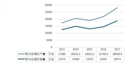 2013-2017年我國制冷壓縮機(jī)產(chǎn)銷統(tǒng)計(jì)