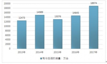 2017年我國制冷壓縮機(jī)行業(yè)銷量約18974萬臺,同比2016年的14645萬臺增長了29.6%,近幾年我國制冷壓縮機(jī)行業(yè)銷量情況如下圖所示:
