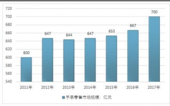 2016年中國(guó)手表行業(yè)市場(chǎng)規(guī)模達(dá)到 667 億元,同比增長(zhǎng) 2.1%,較前幾年增速顯著提升。2017年我國(guó)手表行業(yè)銷售規(guī)模達(dá)到了700億元。近幾年我國(guó)手表行業(yè)零售市場(chǎng)規(guī)模情況如下圖所示: