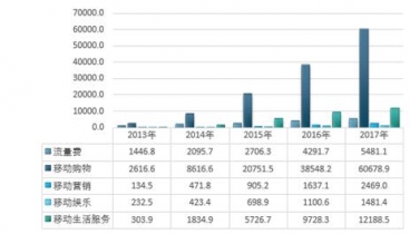 根據(jù)測算,2017年我國流量費(fèi)規(guī)模達(dá)5481.1億元,移動(dòng)購物規(guī)模達(dá)60678.9億元,移動(dòng)營銷規(guī)模達(dá)2469.0億元,移動(dòng)娛樂規(guī)模達(dá)1481.4億元,移動(dòng)生活服務(wù)規(guī)模達(dá)12188.5億元。