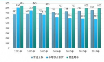 2011-2017年普通本專科、中等職業(yè)教育及普通高中招生人數(shù)(萬人) |