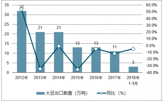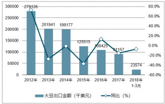 2019年1-3月中國大豆出口數(shù)量為3萬噸,同比下降4.7%;2019年1-3月中國大豆出口金額為23574千美元,同比下降7.4%。