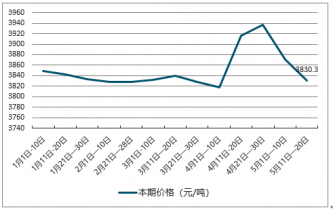 截止至2019年5月中旬,大豆價(jià)格為3830.3元/噸,環(huán)比5月上旬價(jià)格下跌40.2元/噸,跌幅為1%;4月下旬,大豆價(jià)格達(dá)到最高值,為3937.3元/噸,環(huán)比4月中旬價(jià)格上漲21.5元/噸,漲幅為0.5%。4月上旬,大豆價(jià)格呈現(xiàn)最低值,為3818.3元/噸,環(huán)比3月下旬下跌10元/噸,跌幅為0.3%。最高值與最低值相差119元/噸。