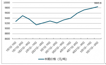 截止至2019年5月中旬,滌綸長(zhǎng)絲價(jià)格為9845.8元/噸,環(huán)比5月上旬價(jià)格上漲63.7元/噸,漲幅為0.7%;滌綸長(zhǎng)絲市場(chǎng)價(jià)格亦在此時(shí)達(dá)到目前為止本年度最高值。2月上旬,滌綸長(zhǎng)絲價(jià)格呈現(xiàn)最低值,為9142.9元/噸,環(huán)比1月下旬下跌219.6元/噸,跌幅為2.3%。最高值與最低值相差702.9元/噸。