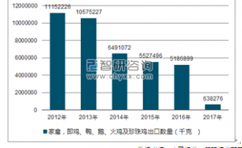 2018年我國家禽,即雞、鴨、鵝、火雞及珍珠雞出口數(shù)量為638276千克 ,出口金額為2234155美元;2019年我國家禽,即雞、鴨、鵝、火雞及珍珠雞出口數(shù)量為5186899千克 ,出口金額為15320182美元。