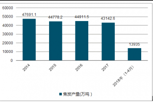 2019年1-4月中國焦炭產(chǎn)量為13935萬噸,同比下降3.5%;2019年1-12月中國焦炭產(chǎn)量為43142.6萬噸,同比下降3.3%。