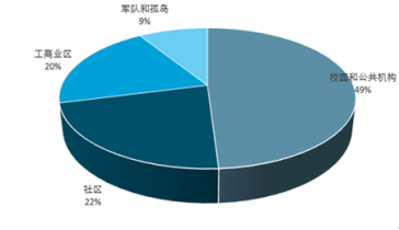 就工程分布來(lái)看,全球微電網(wǎng)以校園和公共機(jī)構(gòu)為主,占比49%;其次是社區(qū)和工商業(yè)區(qū),占比分別為22%和20%;軍隊(duì)和孤島占比總計(jì)9%。