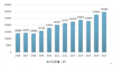 2016年我國汽車經(jīng)銷商總數(shù)為27630家,2017年約29580家。 由于新增市場的需求,經(jīng)銷商網(wǎng)絡(luò)擴張依然是各主機廠家發(fā)展的重中之重。近幾年我國汽車4S店數(shù)量情況如下表所示: