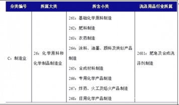 根據(jù)國(guó)家統(tǒng)計(jì)局制定的《國(guó)民經(jīng)濟(jì)行業(yè)分類(lèi)與代碼》,中國(guó)把洗滌用品行業(yè)歸入化學(xué)原料及化學(xué)制品制造業(yè)(國(guó)統(tǒng)局代碼26)中的日用化學(xué)產(chǎn)品制造(C268),其統(tǒng)計(jì)4級(jí)碼為C2681。