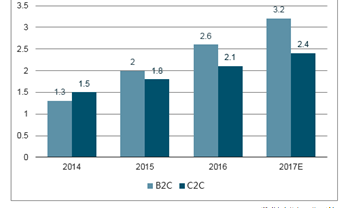 中國網(wǎng)購市場B2C與C2C增速(萬億)