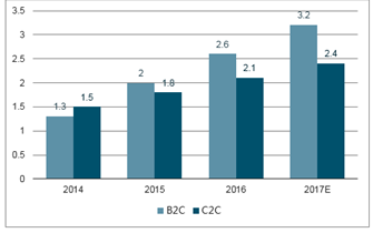中國網(wǎng)購市場B2C與C2C增速(萬億)