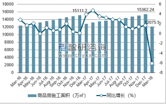 2019年1-3月上海市商品房施工面積為12075.5萬(wàn)㎡,同比下降6.1%;2017年1-12月上海市商品房施工面積為15362.24萬(wàn)㎡,同比增長(zhǎng)1.7%。