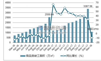 2019年1-3月上海市商品房竣工面積為1088.07萬(wàn)㎡,同比下降9.2%;2017年1-12月上海市商品房竣工面積為3387.56萬(wàn)㎡,同比增長(zhǎng)32.8%。