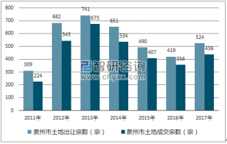 2017年泉州市土地市場(chǎng)出讓宗數(shù)為524宗,成交宗數(shù)為436宗,未成交宗數(shù)為87宗;2016年泉州市土地市場(chǎng)出讓宗數(shù)為419宗,成交宗數(shù)為356宗,未成交宗數(shù)57宗。