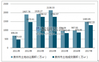 2017年泉州市土地市場(chǎng)出讓面積為1483.85萬(wàn)㎡,成交面積為1292.23萬(wàn)㎡,未成交面積為185.1萬(wàn)㎡;2016年泉州市土地市場(chǎng)出讓面積為987.93萬(wàn)㎡,成交面積為870.96萬(wàn)㎡,未成交面積為107.89萬(wàn)㎡。