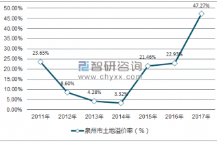 2017年泉州市土地市場(chǎng)溢價(jià)率為47.27%,2016年泉州市土地市場(chǎng)溢價(jià)率為22.93%。