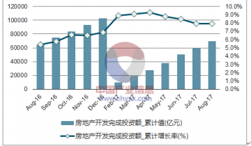 數(shù)據(jù)顯示:2017年1-8月份中國(guó)房地產(chǎn)開(kāi)發(fā)完成投資額69494.00億元,同比增長(zhǎng)7.90%;2016年1-12月份中國(guó)房地產(chǎn)開(kāi)發(fā)完成投資額102580.61億元,同比增長(zhǎng)6.90%。