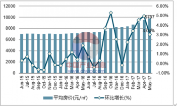 2017年5月常州市房地產(chǎn)平均價格為9797元/㎡,環(huán)比增長3.04%,同比增長34.28%。
