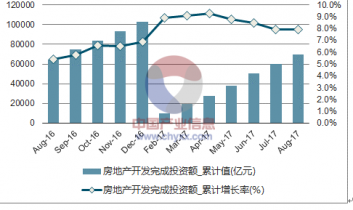 數(shù)據(jù)顯示:2017年1-8月份中國房地產(chǎn)開發(fā)完成投資額69494.00億元,同比增長7.90%;2016年1-12月份中國房地產(chǎn)開發(fā)完成投資額102580.61億元,同比增長6.90%。