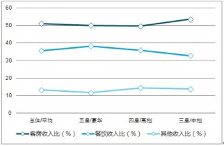 2019年2月,全國星級酒店平均出租率為58.24%,比上月提高8.13%。平均房價為354.73元,每間可供房收入為207.56元;客房收入占比51.13%,餐飲收入占比35.59%。2019年3月份三星及以上星級飯店的客房平均入住率為58.24%,其中四星級飯店的入住率最高達(dá)59.23%,五星級酒店平均入住率為58.95%,三星級酒店入住率達(dá)56.54%。3月份平均房價354.73元,五星級與四星級的房價平均相差150.7元。
