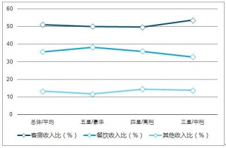 2019年2月,全國(guó)星級(jí)酒店平均出租率為58.24%,比上月提高8.13%。平均房?jī)r(jià)為354.73元,每間可供房收入為207.56元;客房收入占比51.13%,餐飲收入占比35.59%。2019年3月份三星及以上星級(jí)飯店的客房平均入住率為58.24%,其中四星級(jí)飯店的入住率最高達(dá)59.23%,五星級(jí)酒店平均入住率為58.95%,三星級(jí)酒店入住率達(dá)56.54%。3月份平均房?jī)r(jià)354.73元,五星級(jí)與四星級(jí)的房?jī)r(jià)平均相差150.7元。
