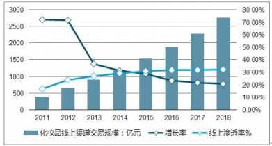 2011-2019年中國(guó)化妝品線上渠道交易規(guī)模及滲透率走勢(shì)