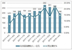 2019年4月份化妝品消費(fèi)收入196億元,與去年同期增長(zhǎng)15.1%。2019年1-4月中國(guó)化妝品累計(jì)消費(fèi)收入達(dá)856億元,同比增加15.9%