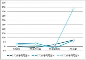 通信板塊業(yè)績保持穩(wěn)健增長:實現(xiàn)營業(yè)收入5655.2億元,同比增長8.4%;歸屬凈利潤187.4億元,同比增長19.2%。單季度看,營業(yè)收入在2018Q1、2018Q2、2018Q3分別同比增長2.8%、11.1%、11.0%;歸屬凈利潤分別同比增長-1.2%、31.4%、21.8%,均保持穩(wěn)健增長態(tài)勢。