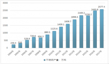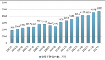 2001-2017年全球不銹鋼產(chǎn)量走勢(shì) |