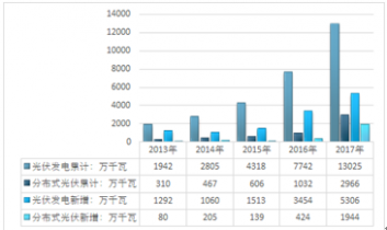 截至2017年底,全國全口徑發(fā)電裝機(jī)容量17.8億千瓦、同比增長7.6%,其中,新增并網(wǎng)太陽能發(fā)電裝機(jī)5306萬千瓦, 82.4%的新增裝機(jī)集中在東、中部地區(qū)。