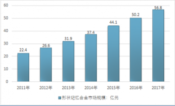 近幾年,我國形狀記憶合金行業(yè)規(guī)模快速增長,從2011年的22.4億元增長到2017年的56.8億元。如下圖所示: