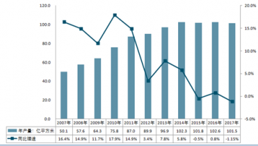 2007-2017年中國陶瓷磚產(chǎn)量及同比增速走勢圖 |