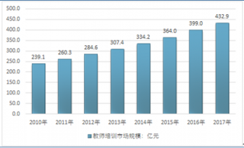 教育行業(yè)按照不同的階段可分為幼兒教育、學(xué)前教育、基礎(chǔ)教育、高等教育和成人教育。據(jù)測(cè)算2015年我國(guó)教師培訓(xùn)市場(chǎng)規(guī)模為364.0億元,2016年我國(guó)教師培訓(xùn)市場(chǎng)規(guī)模為399.0億元,2017年我國(guó)教師培訓(xùn)市場(chǎng)規(guī)模增長(zhǎng)至432.9億元。