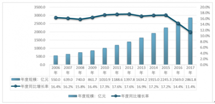 2006-2017年中國電子政務(wù)總體投資規(guī)模及增長率 |