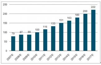 2007-2017年我國主題酒店市場規(guī)模(億元)