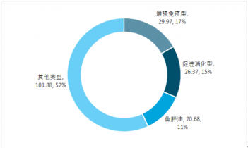 2017年我國增強免疫力嬰幼兒保健品銷售規(guī)模約29.97%,占比17%;促進消化型規(guī)模26.37億元,占比15%;魚肝油類20.68億元,占比11%;其他(鈣劑等)101.88億元,占比57%。