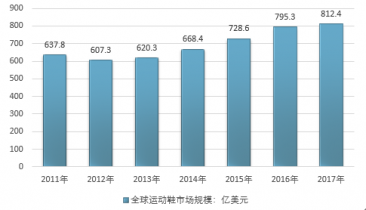 2016年全球運(yùn)動鞋市場規(guī)模為795.3億美元,較2015年的728.6億美元增長9.25%。2017年全球運(yùn)動鞋市場規(guī)模增至812.4億美元。