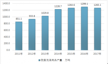 2011年我國洗滌用品產(chǎn)量為851.1萬噸,到2017年我國洗滌用品產(chǎn)量增長至1265.1萬噸。