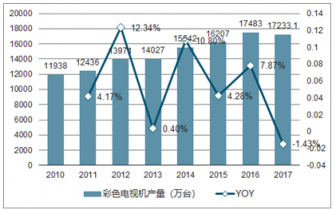 2010-2017年中國(guó)彩色電視機(jī)產(chǎn)量及增速