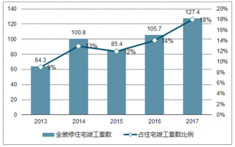 新建住宅全裝修滲透率(全裝修住宅竣工套數(shù)占全國住宅竣工總套數(shù)比重) 已由 2013 年的 8.6%升至 2017 年的近 20%。
