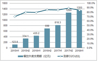 2016-2018 年,中國互聯(lián)網(wǎng)餐飲外賣市場的交易規(guī)模持續(xù)上升,從 457.8 億增至 2,078.3 億,CAGR 為 113.1%;其中 2017 年下半年交易規(guī)模已達(dá) 1,260 億元,占據(jù)到家 O2O 市場規(guī)模的 88.9%。