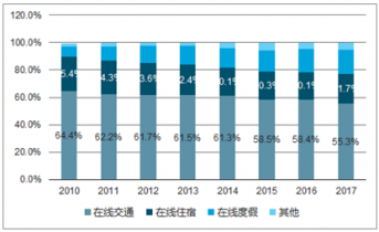 在線交通市場份額過半,居于首位;在線住宿占比在 20%-26%之間;兩者均呈下降趨勢。隨著居民旅游需求的多元化和個性化增強,在線度假迅速發(fā)展,2010-2017 年占比從 7.0%上升至 17.9%。