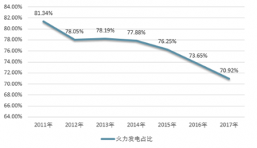 2011-2017年我國(guó)火力發(fā)電占全國(guó)發(fā)電總量比例走勢(shì)圖