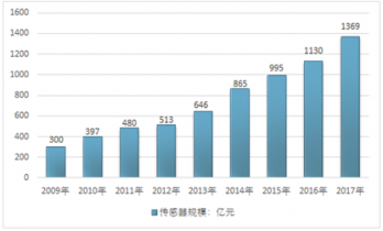 近年來(lái),國(guó)內(nèi)傳感器市場(chǎng)持續(xù)快速增長(zhǎng),年均增長(zhǎng)速度超過(guò)20%,2009年傳感器市場(chǎng)規(guī)模為300億元,2017年達(dá)到1369億元。2017年同比2016年的1130億元增長(zhǎng)了21.15%。近幾年我國(guó)傳感器行業(yè)市場(chǎng)規(guī)模情況如下圖所示: