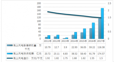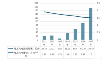 2011-2017年我國(guó)海上風(fēng)電投資規(guī)模及造價(jià)走勢(shì)圖 |