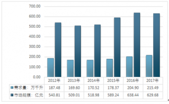 2017年我國果酒消費市場規(guī)模為629.68億元,市場規(guī)模同比下降1.37%;2017年我國果酒消費總量達到215.49萬千升,需求總量同比增長5.17%。