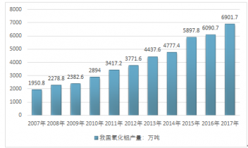 根據(jù)中國國家統(tǒng)計(jì)局?jǐn)?shù)據(jù):我國氧化鋁產(chǎn)量從2004年的702.4萬噸增長至2016年的5897.8萬噸,2017年我國氧化鋁產(chǎn)量增長至6901.7萬噸。