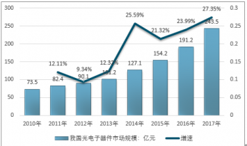 2010-2017年我國光電子器件市場規(guī)模及增速走勢圖 |