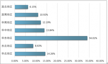 華東地區(qū)是我國最大的光電子器件市場,2017年華東地區(qū)光電子器件市場占全國整體市場的34.01%。